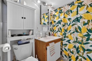 une salle de bain complète, un salon ainsi qu'une cuisine